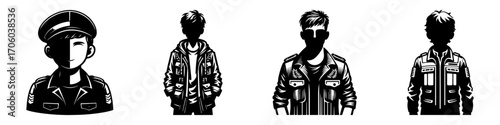 Modern Minimalist Boy with Half Body Wearing Military Jacket Icon, Flat Silhouette of a Casual Outfit Vector for Outdoor Illustration Design