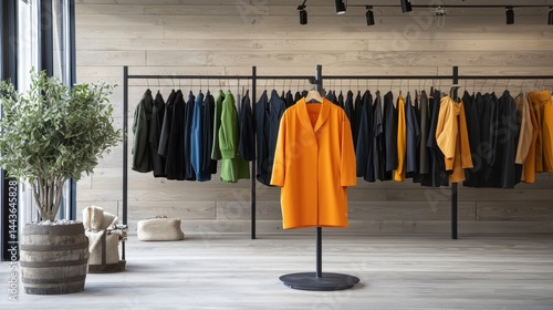 Modern minimalist clothing boutique interior orange coat on display wooden wall metal rack green plant neutral floor apparel fashion retail space