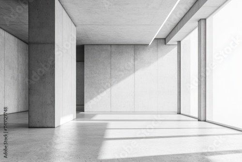 Modern Minimalist Concrete Interior Architecture Design: Sunlight Illuminates a Spacious Room with Large Windows
