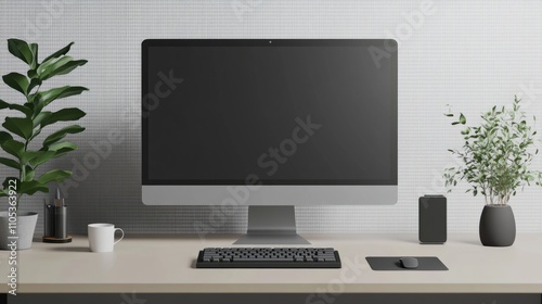 Modern minimalist desk setup featuring a large monitor, wireless keyboard, trackpad, and plant on a transparent background