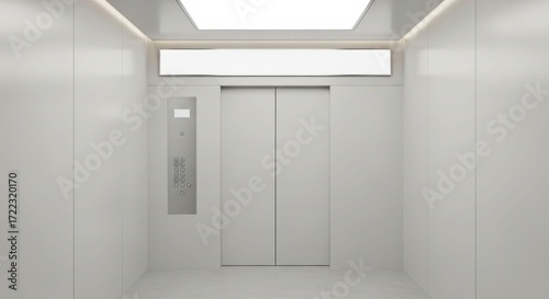 Modern minimalist elevator interior with closed doors, sleek white walls, and subtle lighting.
