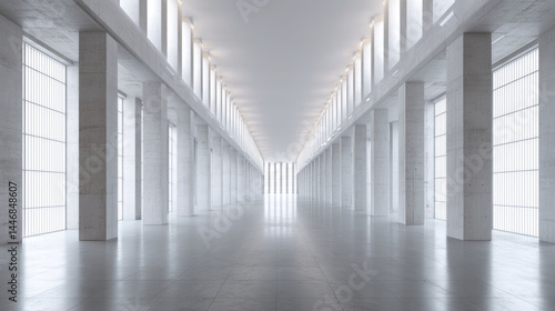 Modern, minimalist hall with columns and large windows. Spacious, bright, and clean interior