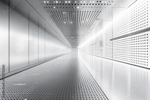 Modern, minimalist hallway with metal walls and perforated ceiling. Ideal for architecture, design, or technology concepts.
