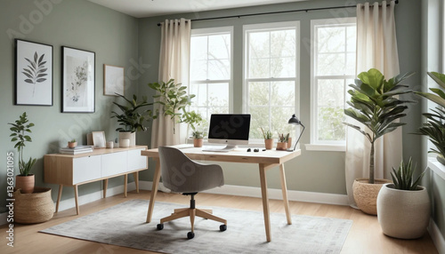 Modern Minimalist Home Office with Sleek Wooden Desk, Ergonomic Chair, and Natural Light – Generative AI