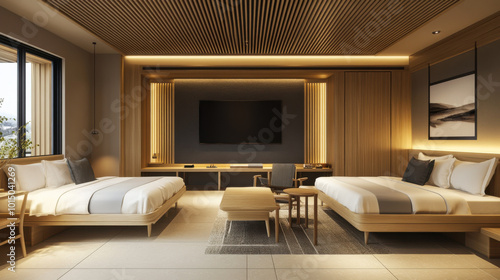Modern minimalist hotel room featuring twin beds with natural wood accents and cozy seating area in a tranquil setting