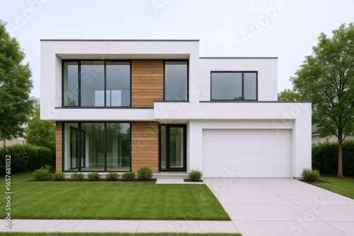 Modern Minimalist House with Clean Lines and Green Lawn, Exterior Architecture Photography