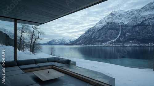 Modern, minimalist house with expansive lake and mountain views.