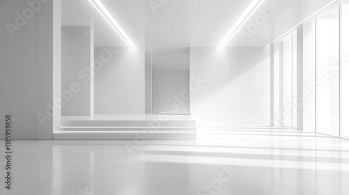 Modern Minimalist Interior Design. A pristine white hallway with minimalist architecture, sleek lines, and soft, natural light. The space is bathed in a calming, airy ambiance.