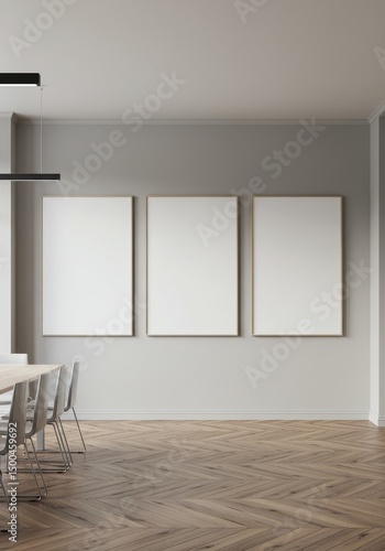 Modern Minimalist Interior Photo with Three Blank Frames on Gray Wall