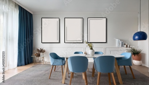 Modern Minimalist Interior Poster Frames Mockup in Monochrome Space with White Table and Blue Chair A Calm Haven Amidst Urban Chaos