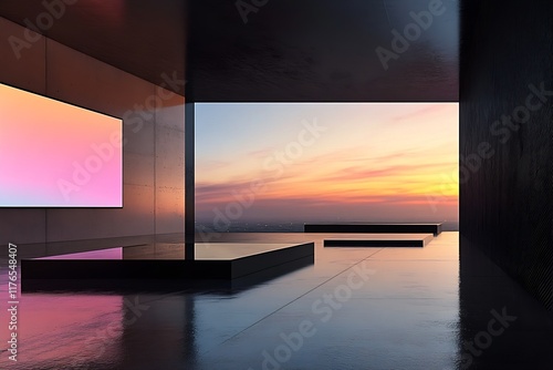 Modern Minimalist Interior with Vibrant Sunset View and Reflective Surfaces : Generative AI