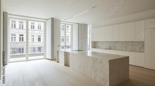 Modern, minimalist kitchen and living space with large windows.