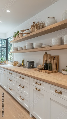 Modern Minimalist Kitchen with Wooden Shelves and Fresh Decor