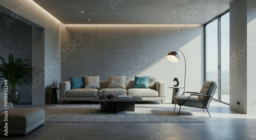 Modern Minimalist Living Room Design with Concrete Walls and Large Windows