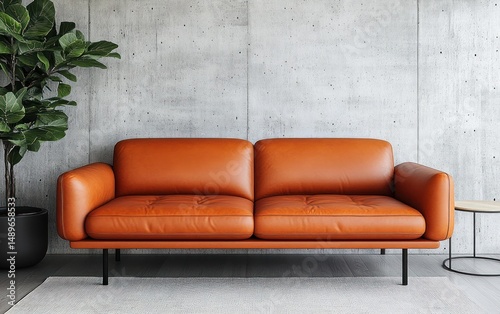 Modern minimalist living room with a brown leather sofa, concrete textured wall, potted plant, and small round side table on a light rug