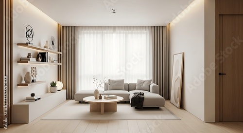 Modern minimalist living room with beige sectional sofa and wooden accents