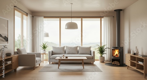 Modern Minimalist Living Room with Fireplace and Panoramic View