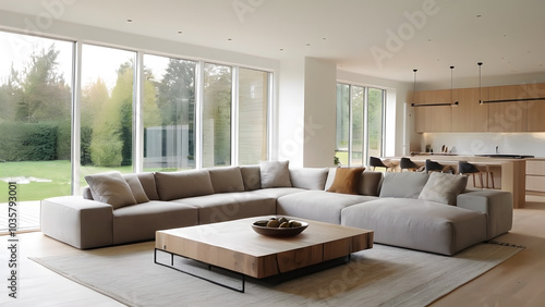 Modern Minimalist Living Room with Large Windows and Comfortable Sofa