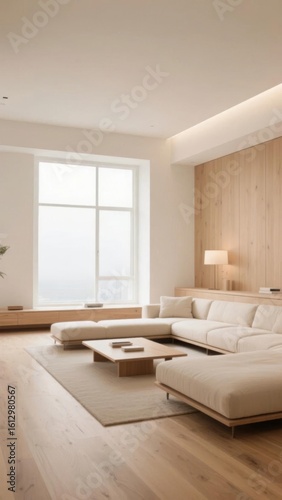 Modern minimalist living room with light wood flooring, large windows, and a sleek white sofa set.