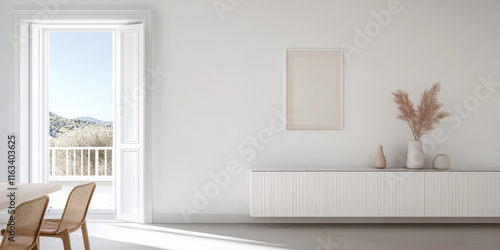 Modern minimalist living room with natural light and simple decor featuring a balcony view