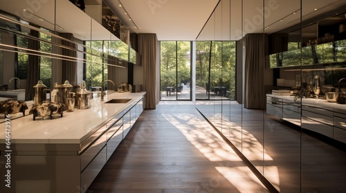 Modern minimalist open-concept kitchen with large windows, marble counters, wood cabinets, and industrial pendant lights.