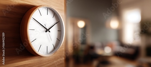 Modern minimalist round clock on wooden surface for interior design and time management concept