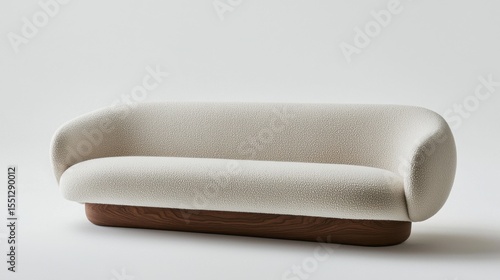 Modern minimalist sofa design in neutral tones displaying elegant curve and natural wood base