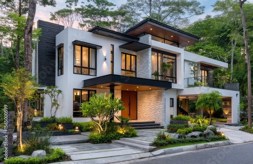 Modern minimalist style, villa exterior design in a housing estate of a sub-ordinary villas complex with lighting