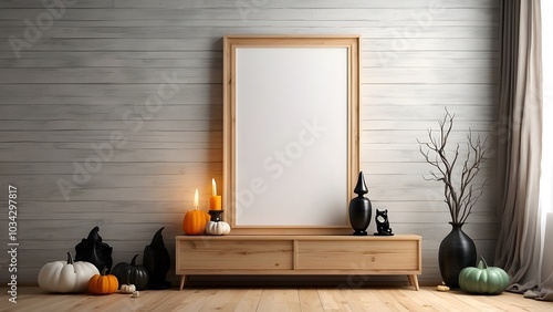 Modern minimalist vertical wall art mockup on cabinet for Halloween, blank frame for vertical wall art living room mockup on table, Halloween spooky scary vibes of the room interior