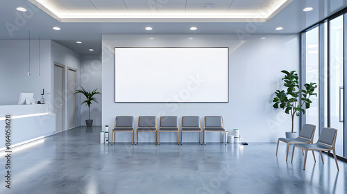 Modern, minimalist waiting room with sleek seating and large whiteboard. Bright, clean design with large windows and natural light.
