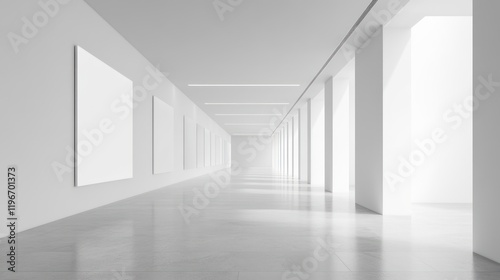 Modern Minimalist White Gallery Corridor, Blank Canvases and Architectural Design