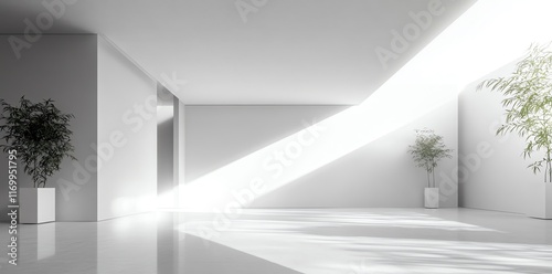 Modern minimalist white interior design with sun shining through a window, plants in white pots on the floor.