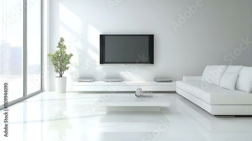 Modern Minimalist White Living Room Interior Design with Flat Screen TV, White Sofa, and Plant
