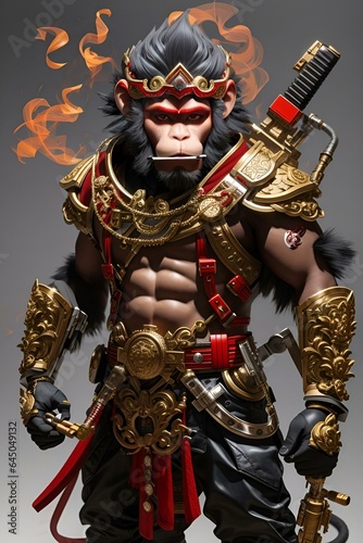 modern monkey king with smacking cigar , right hand with machine gun, red eyes,