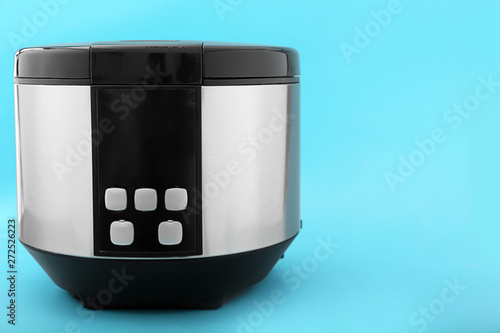 Modern multi cooker on color background