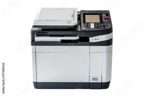 Modern multifunction printer isolated on transparent background. Large white and black printer isolated on white background.