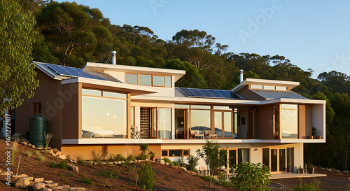 Modern, multi-level home with large windows and solar panels, nestled in a hillside.