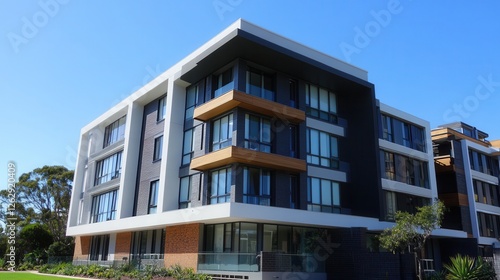 Modern multi-story building showcasing sleek architecture in bright daylight near lush greenery. Generative AI