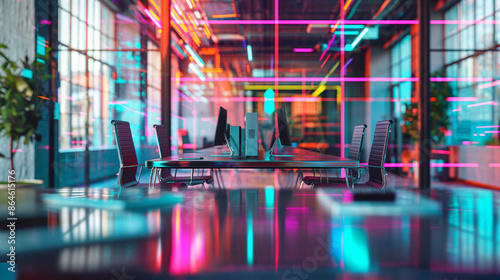 Modern neon cyberpunk open space office interior blurred with information technology overlay. Corporate strategy for finance, operations, marketing. Tables with computers for work. Technology