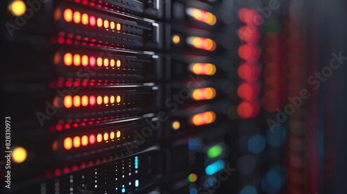Modern network servers with rows of glowing LED lights emphasizing advanced technological infrastructure in a high tech setting