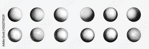Modern noise gritty gradient spheres, illustrated with dotted textures and vintage halftone grunge pointillist ellipses, and a ball with a dissolved spray sand effect for contemporary tattoo designs.