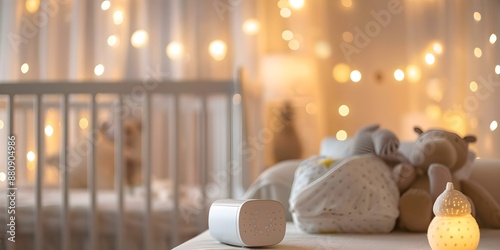 Modern nursery room with cozy smart baby monitor and warm lighting. Concept Baby Monitors, Nursery Decor, Cozy Lighting, Smart Technology, Modern Design