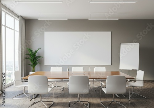 Modern Office Boardroom Interior with Wooden Table and White Chairs Photo