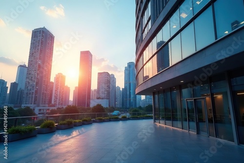 Modern office building exterior, glass facade, city skyline backdrop , office building, skyscraper