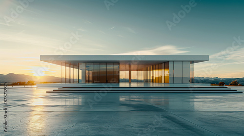 Modern office building, glass windows, evening ambiance, empty urban plaza
