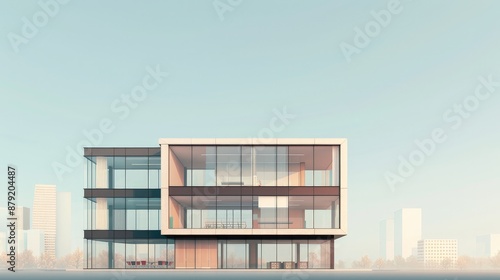 Modern Office Building in 2D Flat Illustration - Architectural Design with Glass Windows in Minimalist City Setting