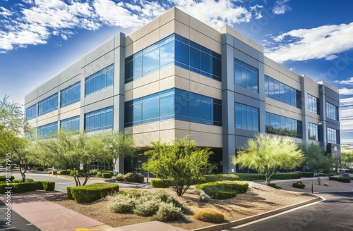 Modern office building in Scottsdale, California with gray and blue exterior, large windows, surrounding greenery, trees, and bright sunny sky with white clouds.