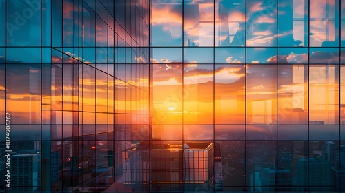 Modern Office Building with Glass Facade Illuminated by Sunset Glow