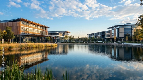 Modern office buildings with a pond and lush greenery in the foreground, reflecting the sky and clouds in the water.