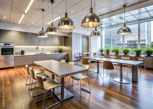 Modern office cafeteria features sleek tables and chairs, stainless steel appliances, and pendant lighting, creating a contemporary break room for employees to relax.